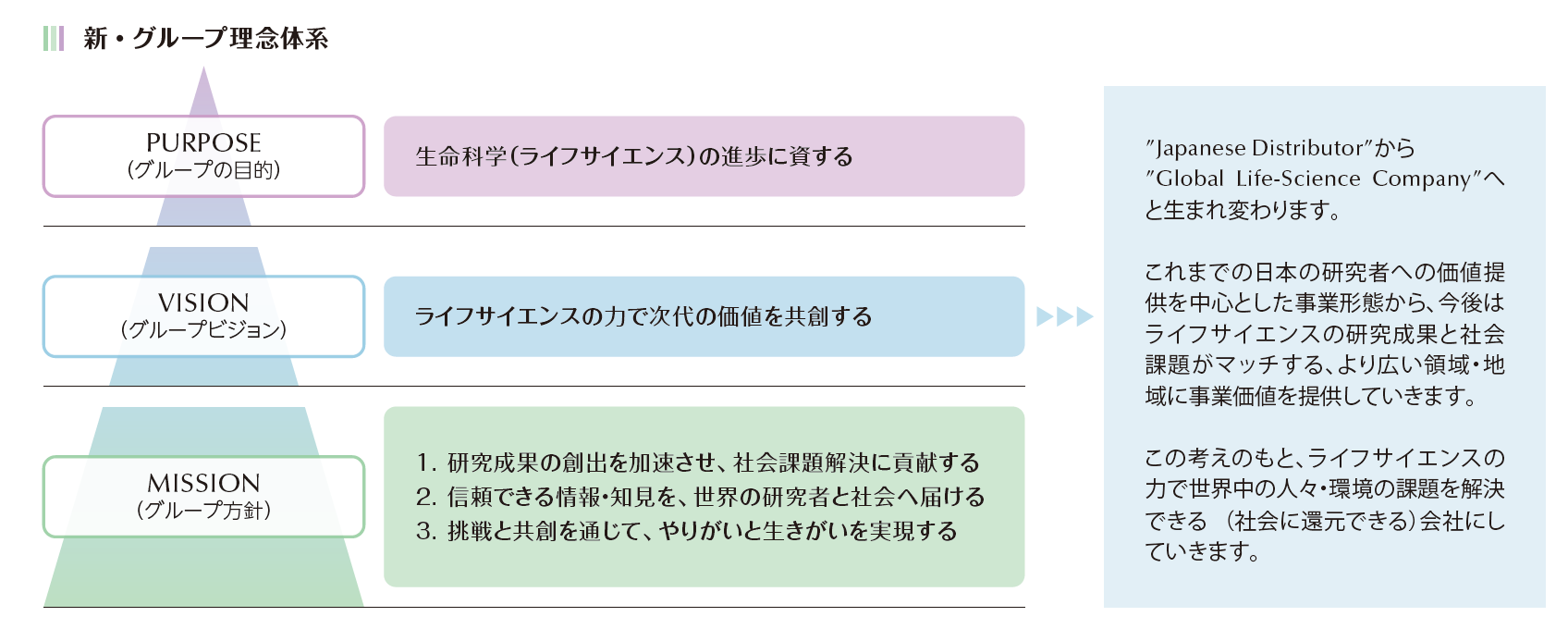 その結果、辿り着いたのが、「ライフサイエンスの力で次代の価値を共創する」という新たなビジョンです。これまで私たちは、“商社”という立ち位置に軸足を置き、“研究者(特に日本の)を支援する”立場を貫いてきました。しかし、この立ち位置と立場に留まっていては、変わりゆく社会の中で多様化・複雑化する社会課題には十分に対応することができず、したがって私たちの企業価値を高めることもできません。私たちは、今後、商社とメーカーの両方の機能を持った“パートナー”という立ち位置に軸足を移し、“研究者と一体になって社会課題を解決し、新たな価値を共創する”立場へと、大きく前進していきたいと思っております。その意志の表明が、今回策定したビジョンです。