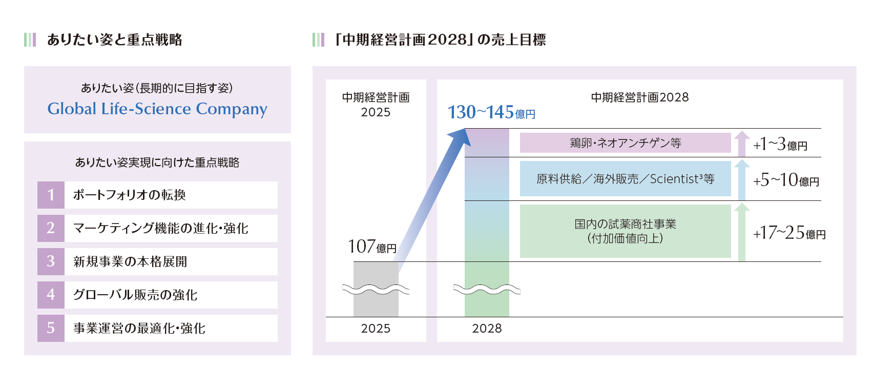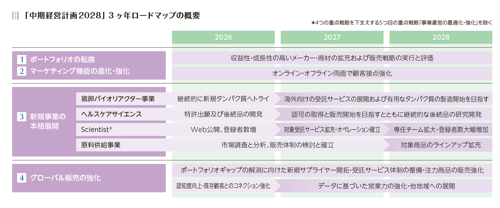 2026年12月期を初年度とする「中期経営計画2028」(3ヶ年)では、“ありたい姿”実現に向けた第1ステップとして、「次代の価値を共創するための基盤づくりの期間」と位置づけ、これら5つの重点戦略を軌道に乗せていくことに重点を置いた取り組みに注力してまいります。すなわち、次期中計以降における成長の本格化に向けて、本中計期間においては成長投資を優先し、売上・利益の目標を少し控えめな設定としております。紙面の制約もあり、5つの重点戦略について踏み込んだご説明ができておりませんが、今後、進捗状況を適時お伝えしてまいります。