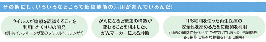 このように、私たちの健康や病気と密接な関係がある糖鎖のメカニズムを解明していけば、健康に役立つ技術や病気を克服する技術を生み出していくことができるはずです。こうした確信のもと、日本がリードしてきた糖鎖研究は、バイオ医薬品をはじめとした多くの研究成果が積み重なってきたことで、今、さまざまな可能性の扉を開きつつあります。
