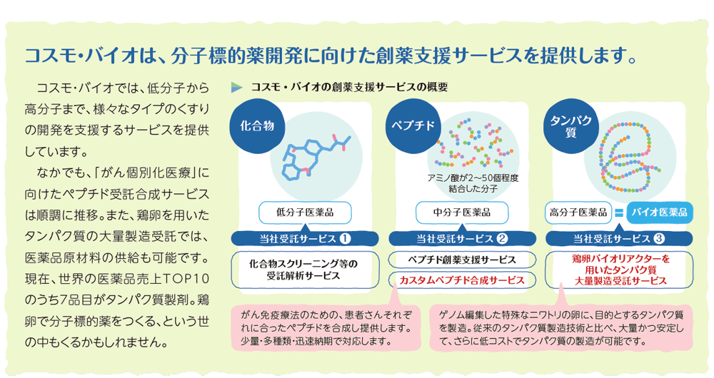 2000年以降のがん分子標的薬の登場によって、がん治療は急速に進歩しています。副作用の軽減により、はたらきながらがん治療をする時代にもなってきました。がん分子標的薬のますますの開発が急がれるなか、コスモ・バイオは、創薬支援サービスや新薬開発に寄与する製品を提供し、新薬の登場を支援します。