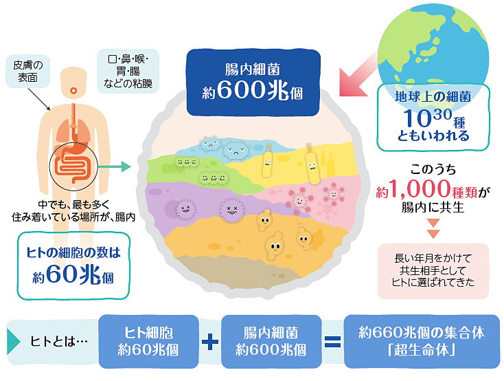 (注) 研究が進んでいる腸内細菌以外にも、今後、ヒトに生息する多様な細菌のヒトの健康へのはたらきが明らかになっていくと、「超生命体」として集合体に加えるべき細菌の数は、もっともっと増えていくのかもしれません。